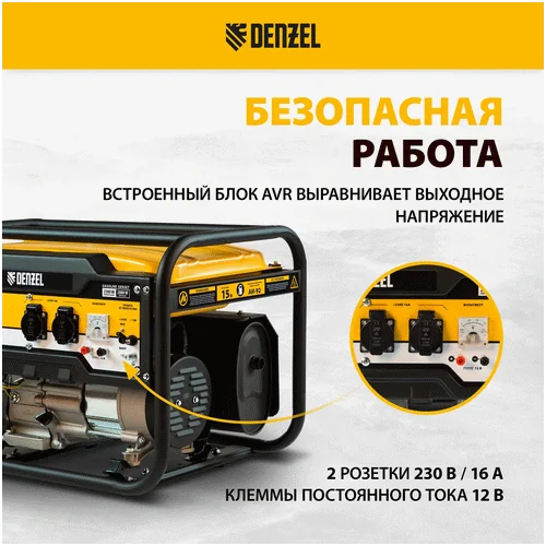 - Бензиновый генератор DENZEL PS 25, 2,5 кВт, 230В, 15л, ручной стартер 946814 оснащен вольтметром для контроля за напряжением.