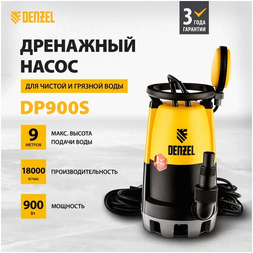 Дренажный насос для чистой и грязной воды DENZEL DP-900S 97269 используется для откачки жидкости из затопленных помещений, а также для организации полива и подачи воды из колодцев и открытых водоемов.